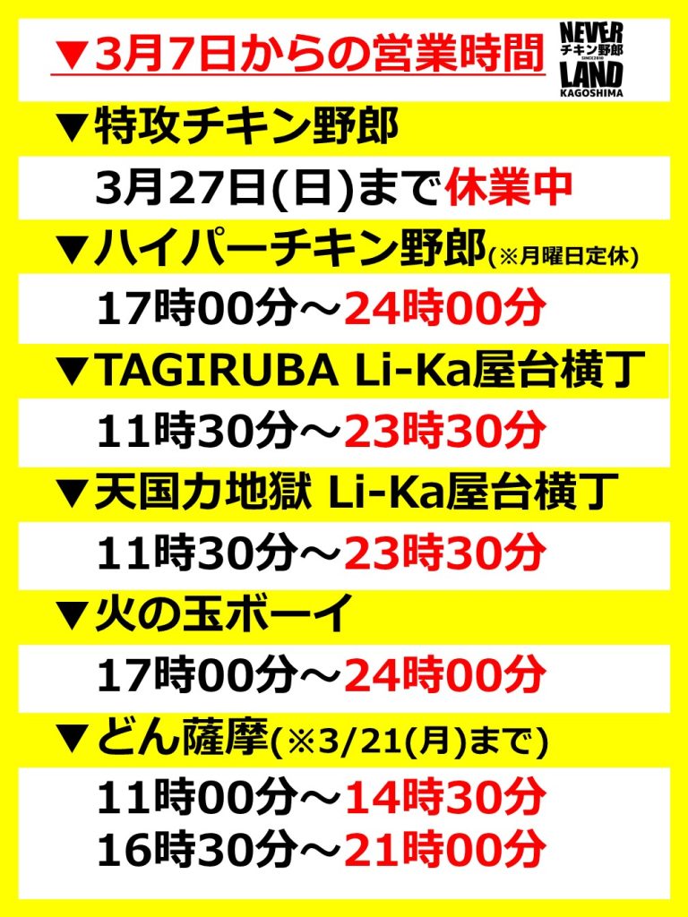 鹿児島店舗通常営業再開! 3月 07, 2022 お知らせ 皆様、お待たせいたしました!!鹿児島県のまん延防止解除に伴い、3月7日(月)よりNeverLand系列鹿児島店舗は、通常営業を再開致します!引き続き感染対策は行いながら、皆様のご来店をお待ちしております。