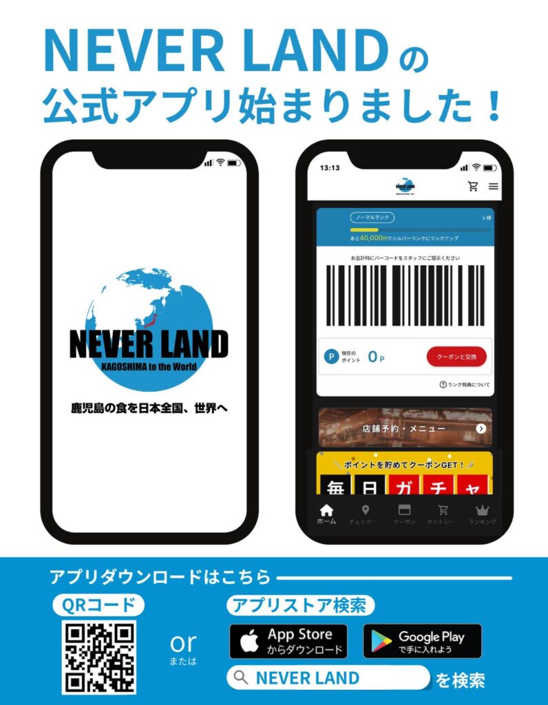 NEVER LAND系列店舗、特攻チキン野郎、ハイパーチキン野郎、ハイパーチキン野郎別館、タギルバ、天国カ地獄、どん薩摩でのご利用で美味しく、お得に![]()