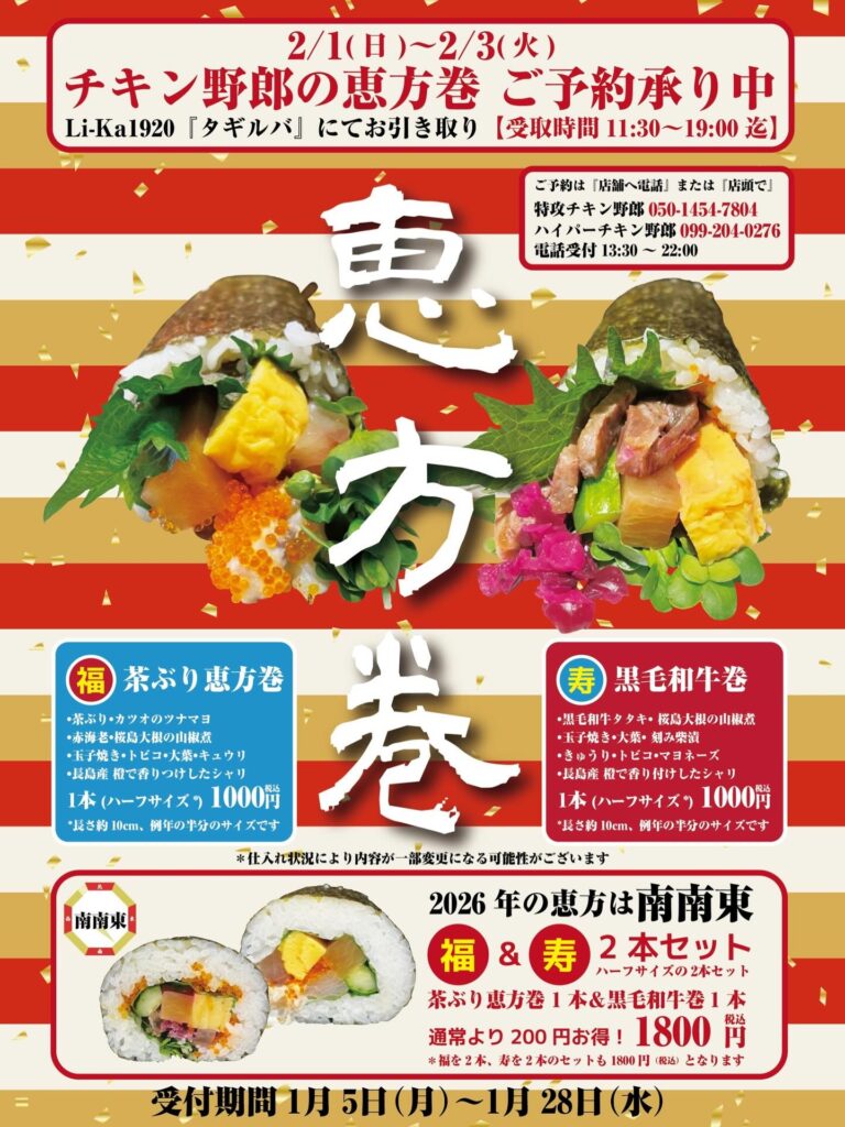 福を巻き込む!恵方巻き予約スタート 1月 05, 2026 未分類 \福を巻き込む!恵方巻き予約スタート/2026年の節分を彩る「NeverLand特製恵方巻き」の予約受付を開始します!今年も魚&肉を両方楽しめる2種類でご用意いたします! 名物の茶ぶりの恵方巻き 黒毛和牛の恵方巻きシャリも長島産の橙で香り付けして、鹿児島を味わう恵方巻きです 予約締切:1/28(水)受取日時:2/1(日)~2/3(火)11:30-19:00受取場所:Li-Ka1920『タギルバ』ご予約は各店舗また、各スタッフまでお申し付けください!!2026年の恵方は**【南南東】まるかぶりして、最高の1年をスタートさせましょう!